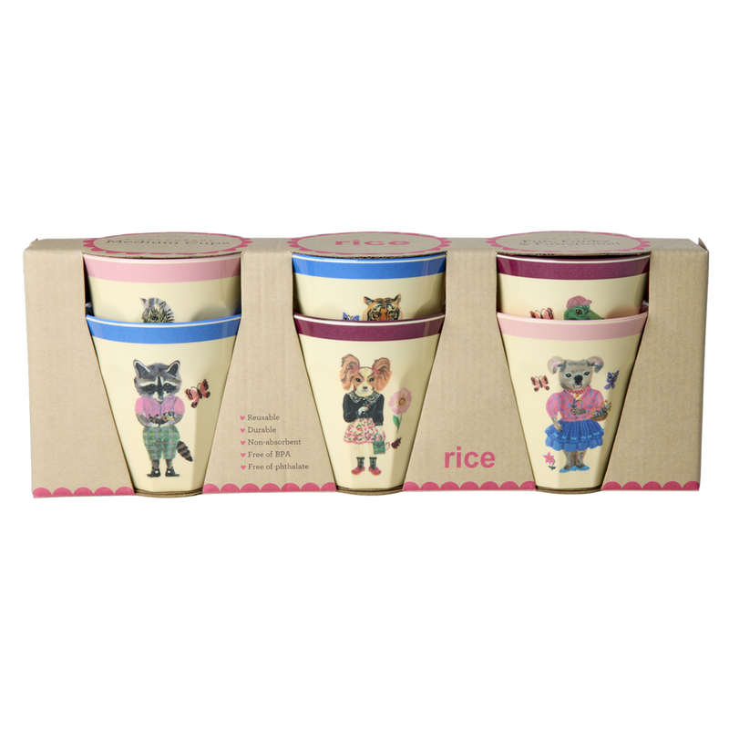 Vi är helt och hållet förälskade i dessa prints designade av Nathalie Lété. Den chica zebran, den klädda tigern och den tennisspelande krokodilen finns alla i den här lådan med 6 av våra medelstora melaminkoppar. Melamin är hållbart och idealiskt för dagligt bruk tack vare sin styrka och enkla rengöring. Den absorberar inte färg eller smak från mat – vilket gör den superpraktisk för både barn och vuxna!